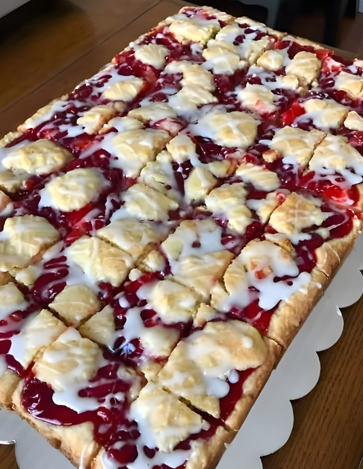 Als je van kersen houdt, dan wordt dit jouw nieuwe lievelingsrecept. Deze kersenrepen combineren een boterig, krokant deeg met een sappige kersenvulling en een mooi glanzend laagje glazuur. Ze zijn verrassend eenvoudig te maken en passen bij elke gelegenheid: van een doordeweekse koffiepauze tot een feestelijke desserttafel. De repen snijden prachtig in kleine vierkantjes en zien eruit alsof ze zo uit de bakkerij komen – maar dan gewoon uit je eigen oven.