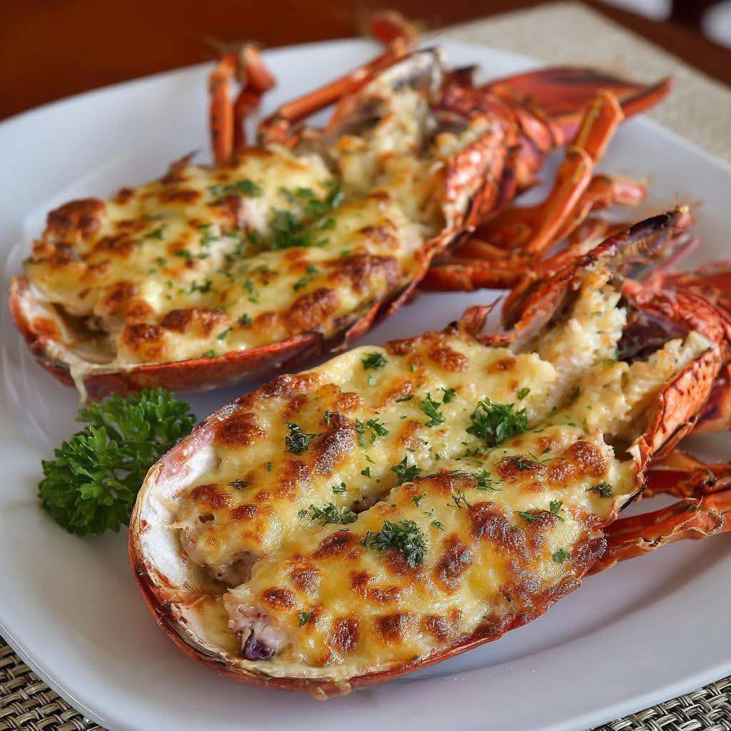 Een verrukkelijk Frans gerecht van kreeftenvlees in een romige witte wijnsaus, gegaard in de schaal en gegarneerd met kaas.
