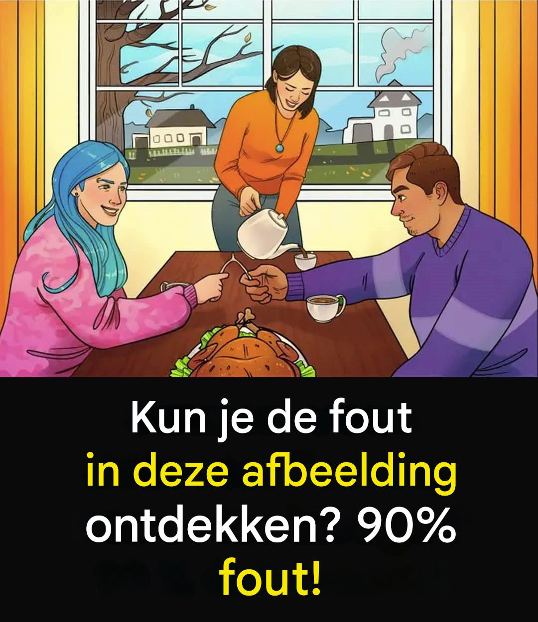 Kijk goed naar de afbeelding: drie mensen zitten rond een tafel voor een feestelijke maaltijd. Twee van hen trekken aan een kalkoenbotje om een wens te doen, terwijl de derde een drankje in een theepot schenkt. Alles lijkt normaal… maar één detail klopt vreemd genoeg niet.