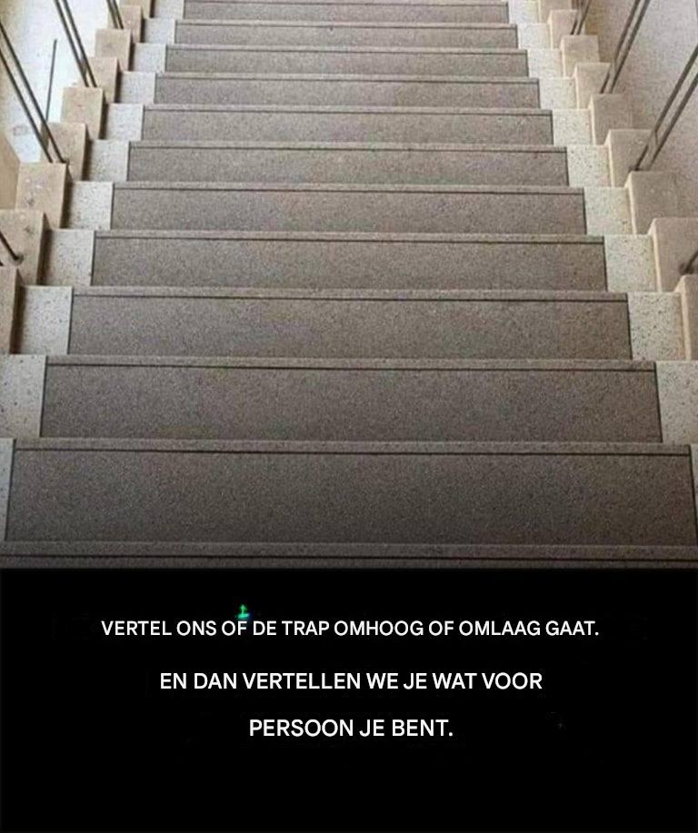 Wie had gedacht dat een simpele afbeelding twijfel kon zaaien… en ons zoveel kon vertellen? Als we naar een trap kijken, hebben sommige mensen het gevoel dat ze omhoog gaan, anderen omlaag, alsof onze geest al een richting kiest voordat we er zelfs maar over nadenken. Wat als deze eerste indruk iets subtiels, maar tegelijkertijd diepgaands onthult over hoe we onze dagen beleven? Neem even de tijd, kijk naar de afbeelding… en laat je meevoeren.