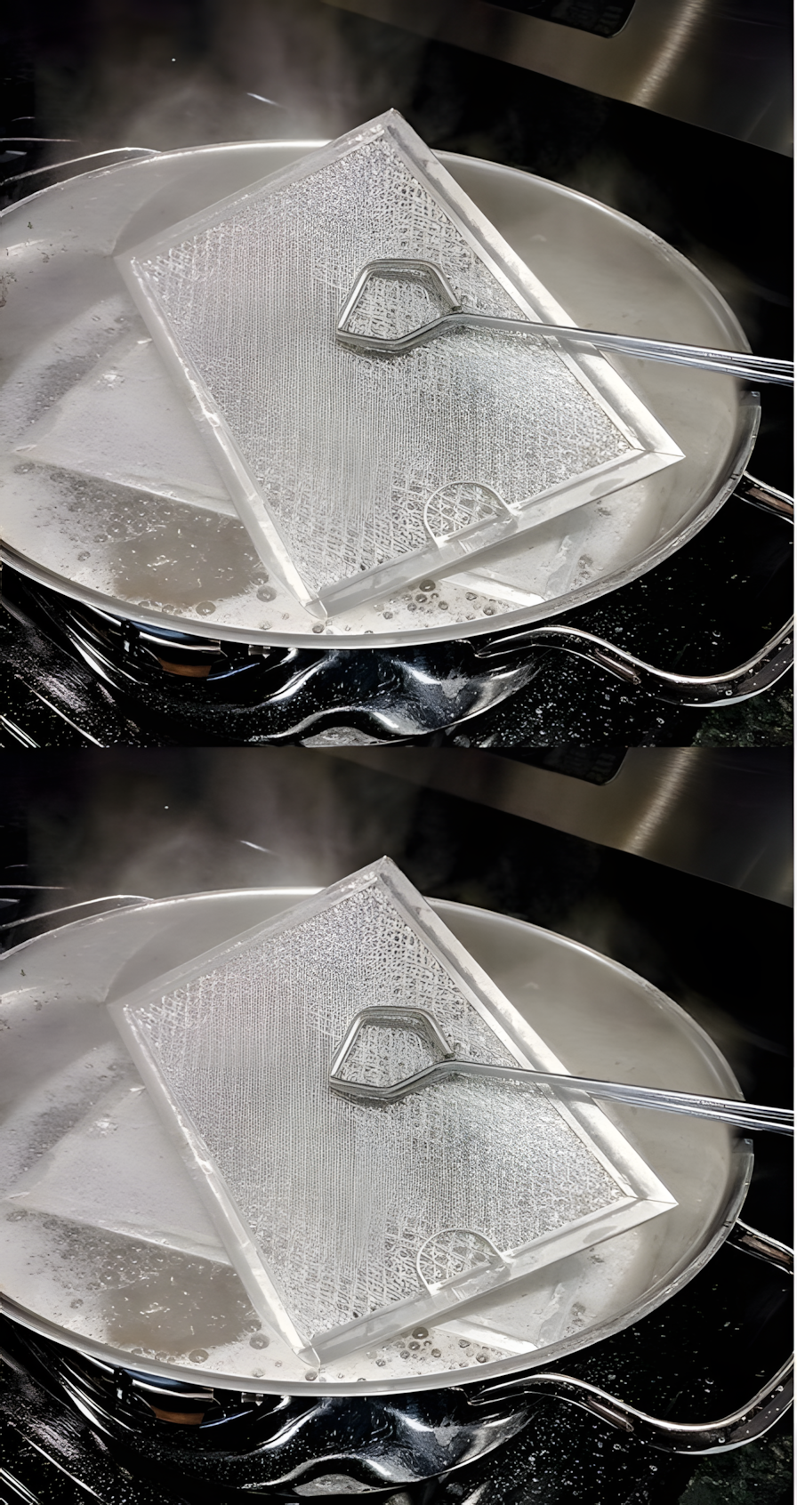 Dompel de ventilatieopeningen onder: Zet het vuur uit om overkoken te voorkomen door de reactie tussen baking soda en water. Plaats de ovenventilatieopeningen voorzichtig in de hete baking soda-oplossing met behulp van uw keukenschaartang.