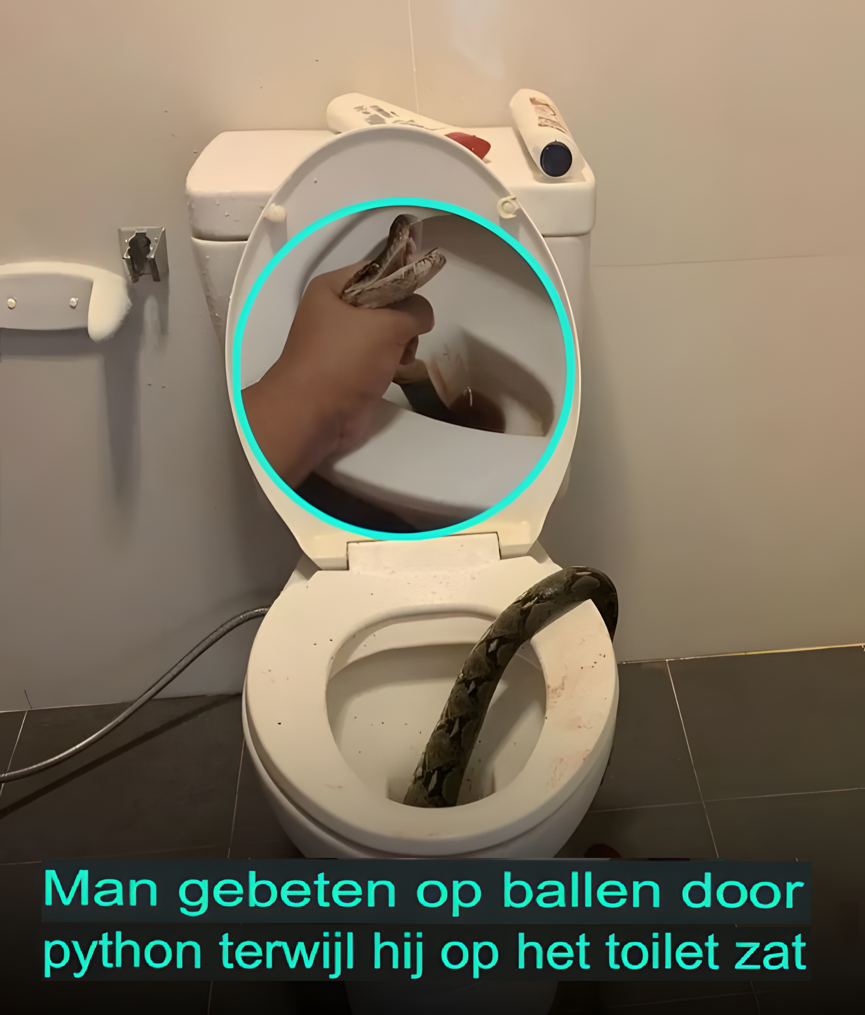 « Ik reikte naar beneden en tot mijn schrik greep ik een slang bij de nek, met zijn giftanden nog steeds in het lichaam, » zei de man, waarna hij beschreef hoe hij zichzelf bewapende met een toiletborstel en de strijd aanging met de slang die het op testikels gemunt had.