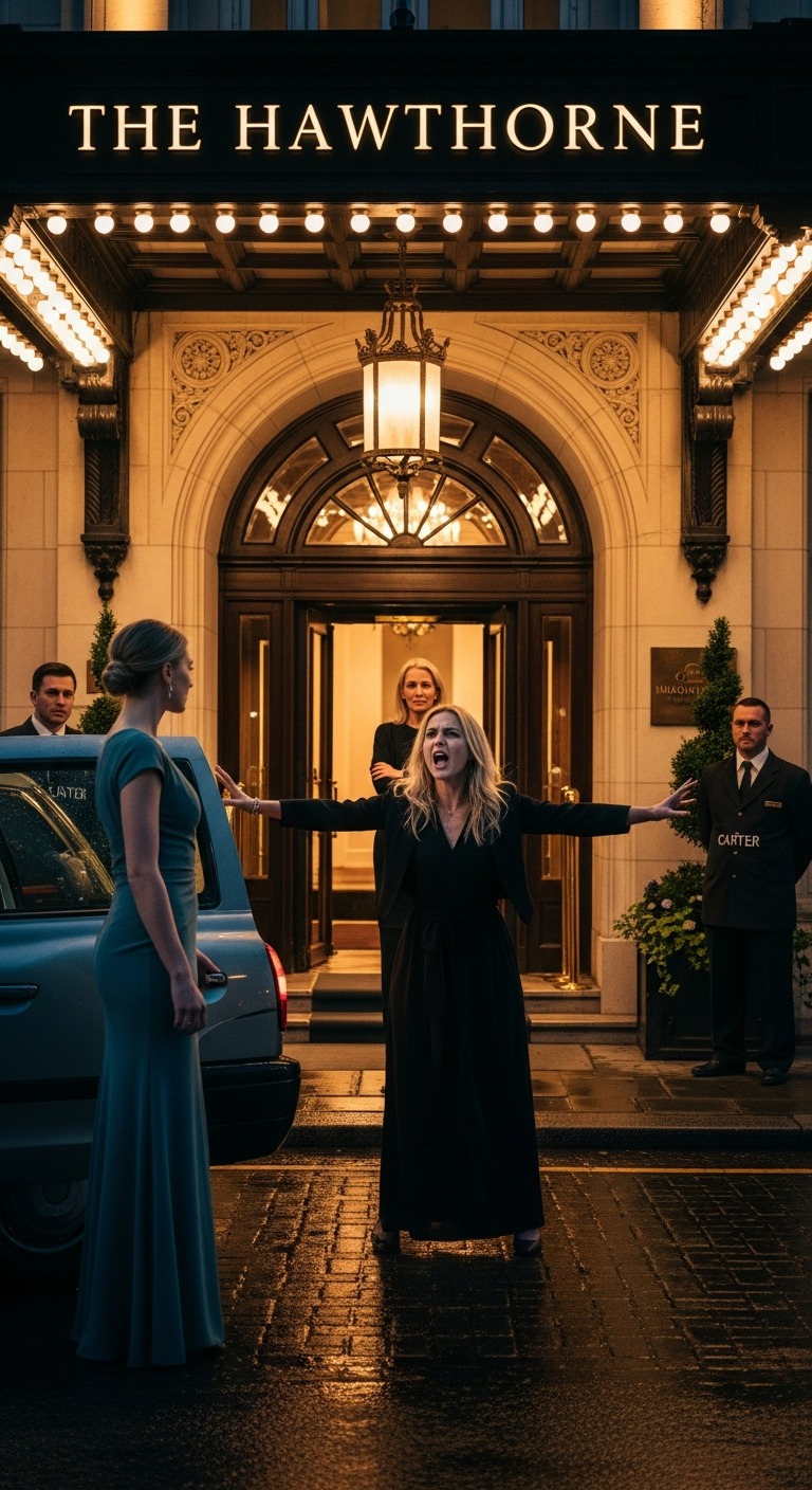 Mijn zus liet een scherpe, blaffende lach horen die de andere gasten die binnenkwamen, hadden moeten horen. « Mijn god, Evelyn, » grijnsde ze, terwijl ze me van top tot teen opnam. « Je kunt je hier niet eens een kamer veroorloven en je probeert binnen te komen? Dit is een privé-evenement. »