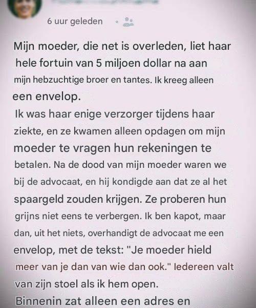 Dus toen ik in het kantoor van de advocaat zat, omringd door familieleden die nauwelijks waren komen opdagen, behalve als er geld in het spel was, geloofde ik dat ze me misschien, heel misschien, had gezien. Dat ze wist wat die jaren hadden gekost – en wat ze hadden betekend.