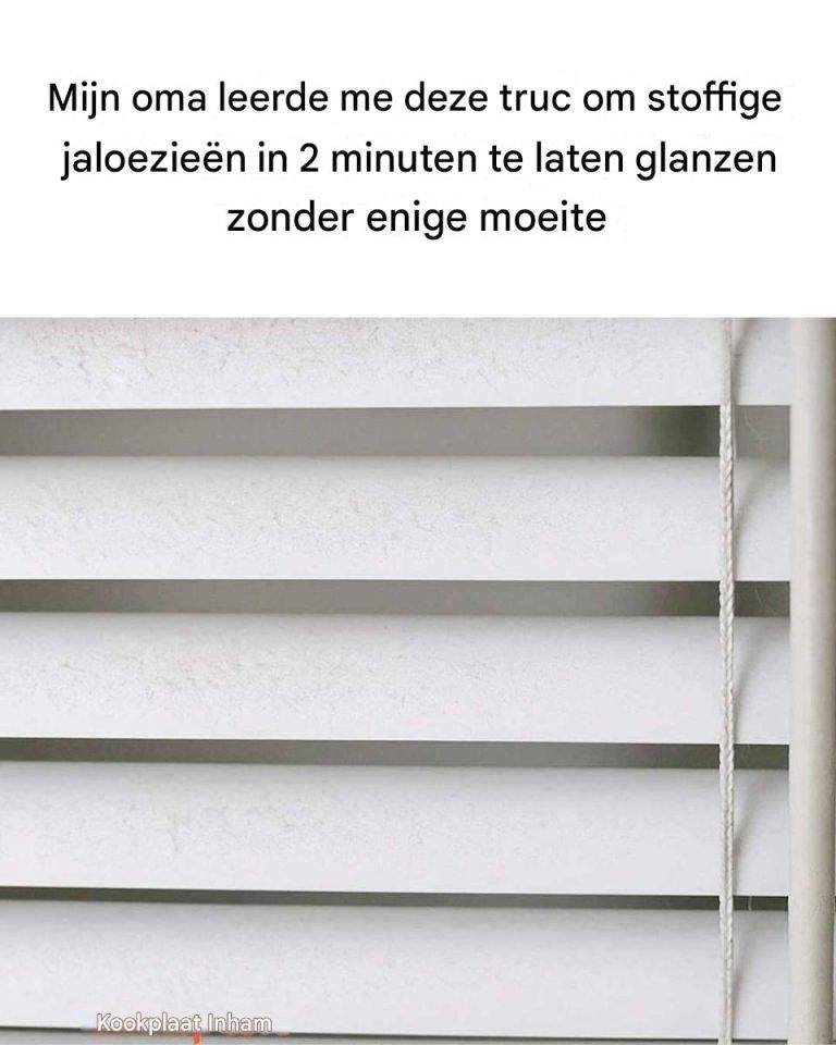 Mijn oma, met haar jarenlange wijsheid en talent voor huishoudelijke trucjes, leerde me een ongelooflijke truc waarmee stoffige jaloezieën in slechts twee minuten in een glimmende bril veranderen. Deze eenvoudige maar effectieve methode vereist geen enkele inspanning en maakt gebruik van alledaagse huishoudelijke artikelen. Zo krijg je moeiteloos die glinsterende jaloezieën.