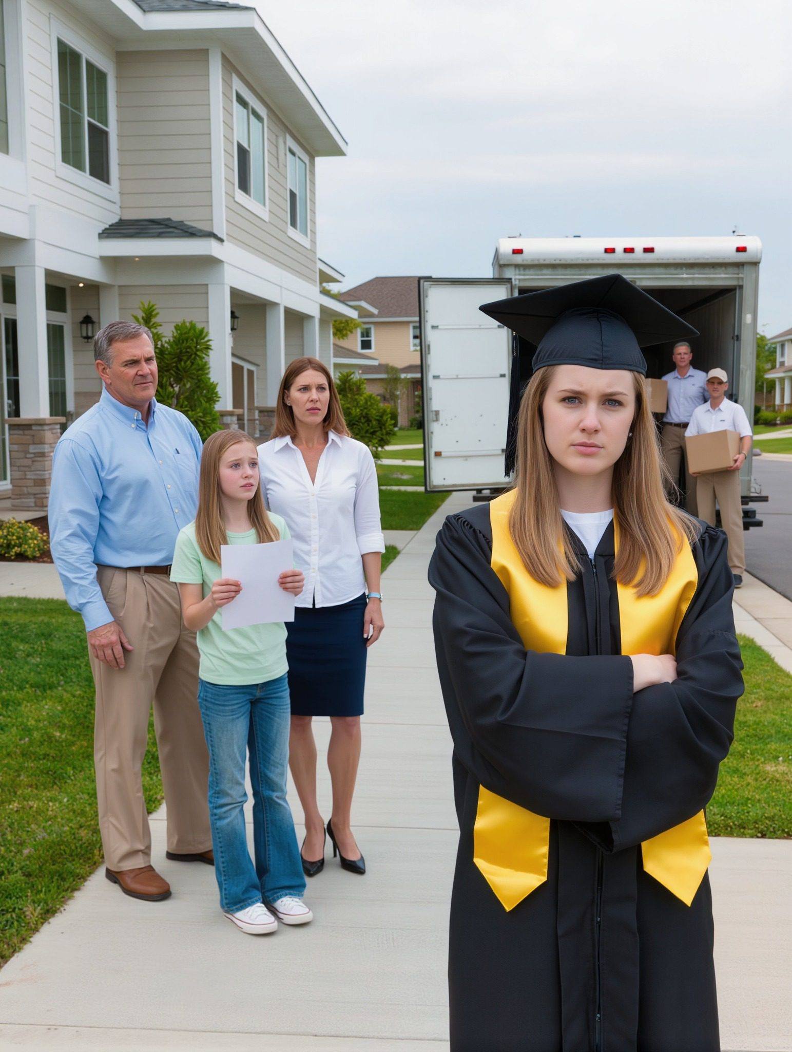 « Hé zusje, » zei Ashley met een stem die zowel opgewekt als kwetsbaar klonk. « Dit huis staat nu op mijn naam. Mam en pap willen dat je deze week vertrekt, zodat ik het kan verkopen. Ik heb al een koper. »
