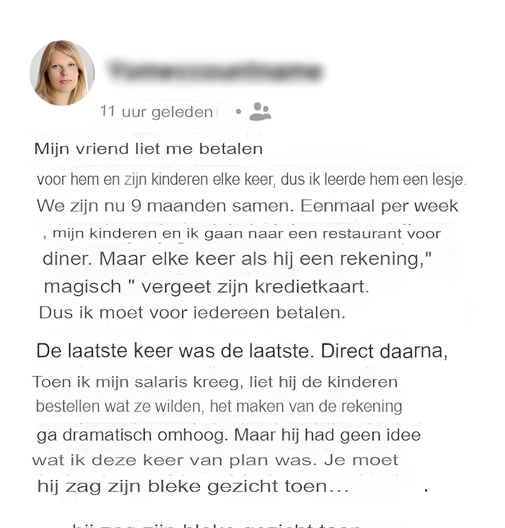 Na een moment keek hij de vrouw met een verlegen uitdrukking op zijn gezicht aan en zei: « Ik denk dat ik dit ben vergeten in de andere spijkerbroek die ik wilde dragen. » De vriend van de vrouw vroeg of ze deze keer voor het avondeten kon betalen, maar de vrouw had er genoeg van en pakte haar spullen, klaar om het restaurant te verlaten zonder zelfs maar te eten. Toen haar vriend de vrouw zag weggaan, eiste hij dat ze hem vertelde wat ze deed en waar ze naartoe ging. Ze vertelde hem dat ze niet opnieuw voor hem en zijn kinderen wilde betalen en verliet het restaurant.