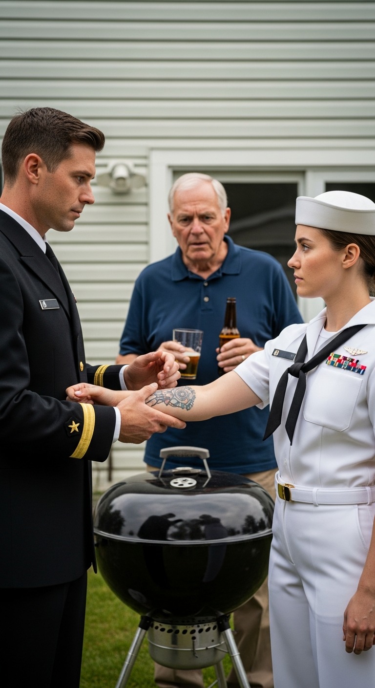 Reins was midden in een verhaal over een kapotte propeller en een mislukte landing toen zijn blik op mijn linkeronderarm viel. De mouw van mijn gala-uniform reikte niet tot mijn elleboog. De kleine tatoeage daar – inkt die ik had laten zetten in een moment dat jeugd en loyaliteit zwaarder wogen dan de regels – piepte tevoorschijn als een geheim dat had leren ademen in het daglicht.