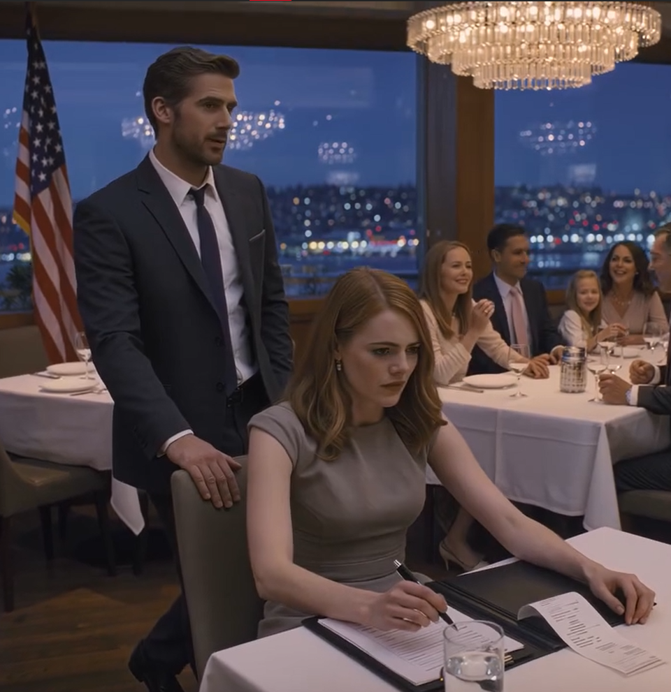 In het restaurant kondigde mijn zus aan: « Rachel, zoek een andere tafel, deze is voor familie, niet voor geadopteerde meisjes. » Ze lachten allemaal en stemden in. Toen legde de ober een biljet van $ 3270 voor me neer, voor hun hele diner. Ik glimlachte, nam een slokje en betaalde rustig.