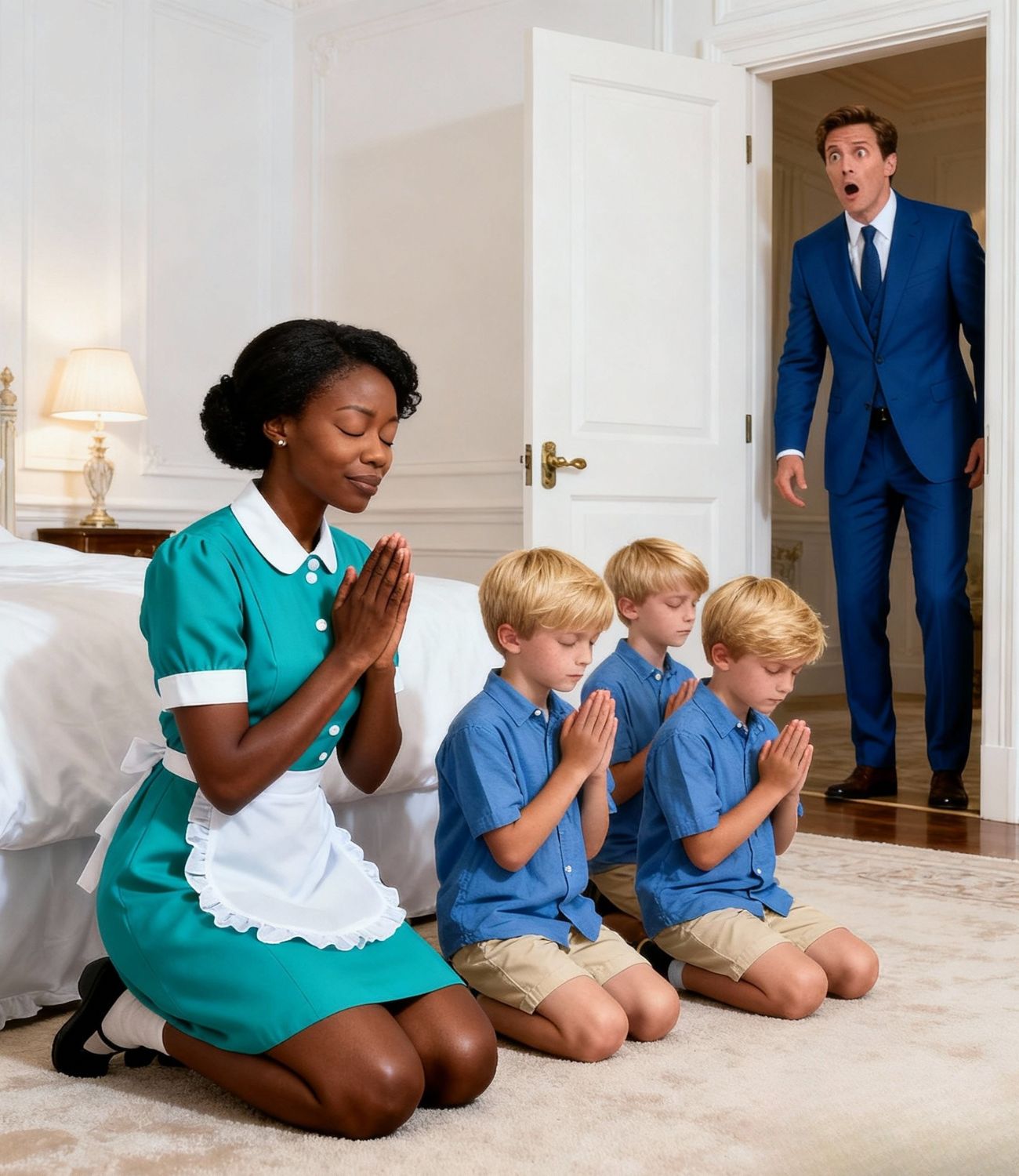 Ze droeg een eenvoudige, professionele zwarte jurk met een klein wit schortje – een uniform dat door het bureau was voorgeschreven en dat scherp contrasteerde met de steriele elegantie van de moderne kamer. Maar zij was het niet die hem de adem benam.