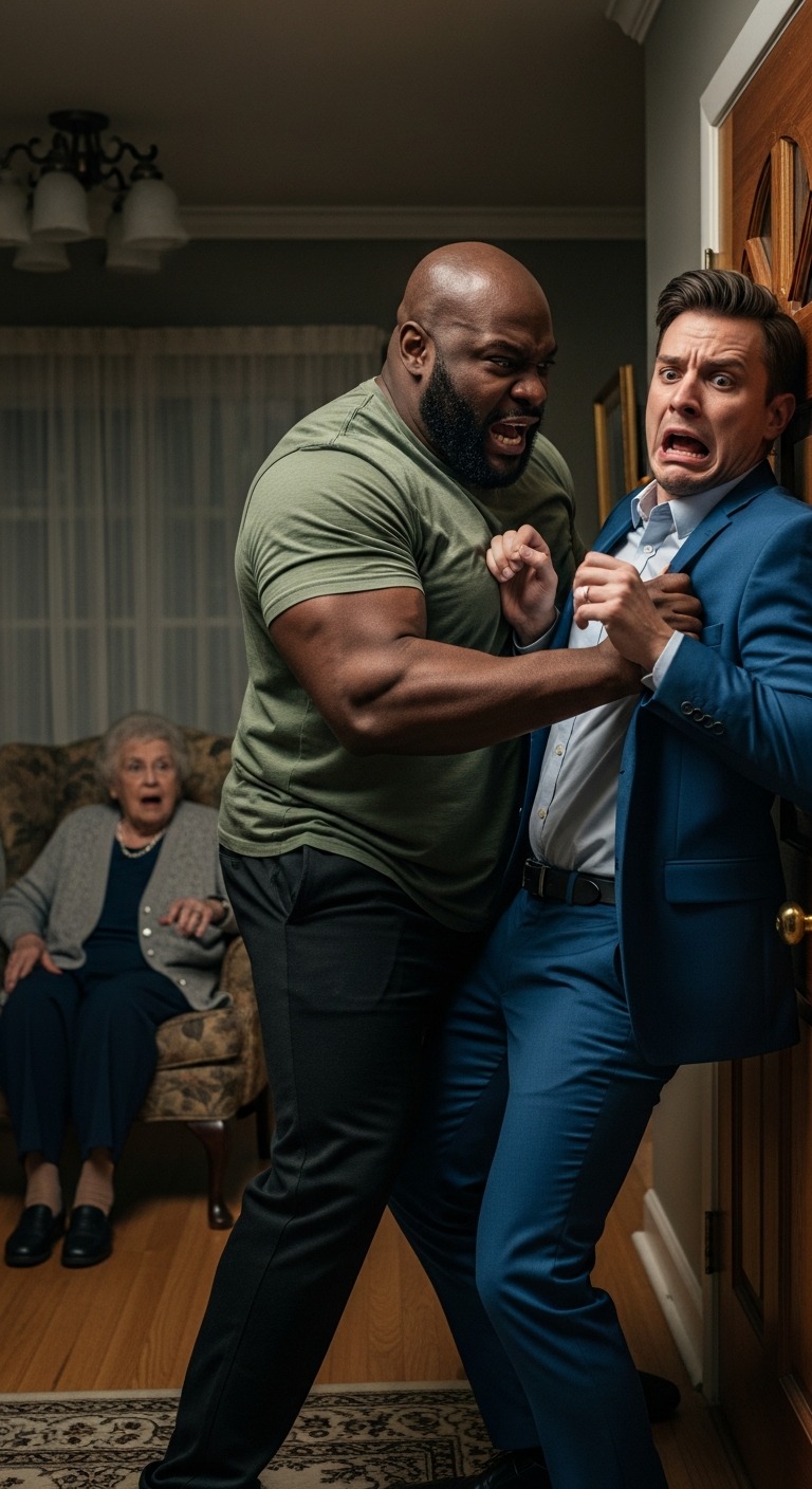 ‘Hallo?’ klonk een mannenstem van binnen. Ik keek langs de oude vrouw en zag hem – lang, mager, met de koude, harde ogen van iemand die te veel had meegemaakt. De gevangenistatoeages op zijn vingers vertelden me alles wat ik moest weten. Ik verstijfde, mijn hand greep instinctief naar het kleine zakmesje dat ik bij me droeg. ‘Wie bent u?’ vroeg ik, met een vlakke stem.