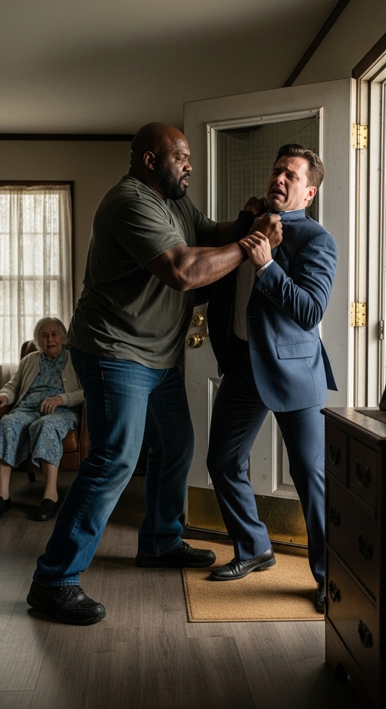 ‘Hallo?’ klonk een mannenstem van binnen. Ik keek langs de oude vrouw en zag hem – lang, mager, met de koude, harde ogen van iemand die te veel had meegemaakt. De gevangenistatoeages op zijn vingers vertelden me alles wat ik moest weten. Ik verstijfde, mijn hand greep instinctief naar het kleine zakmesje dat ik bij me droeg. ‘Wie bent u?’ vroeg ik, met een vlakke stem.