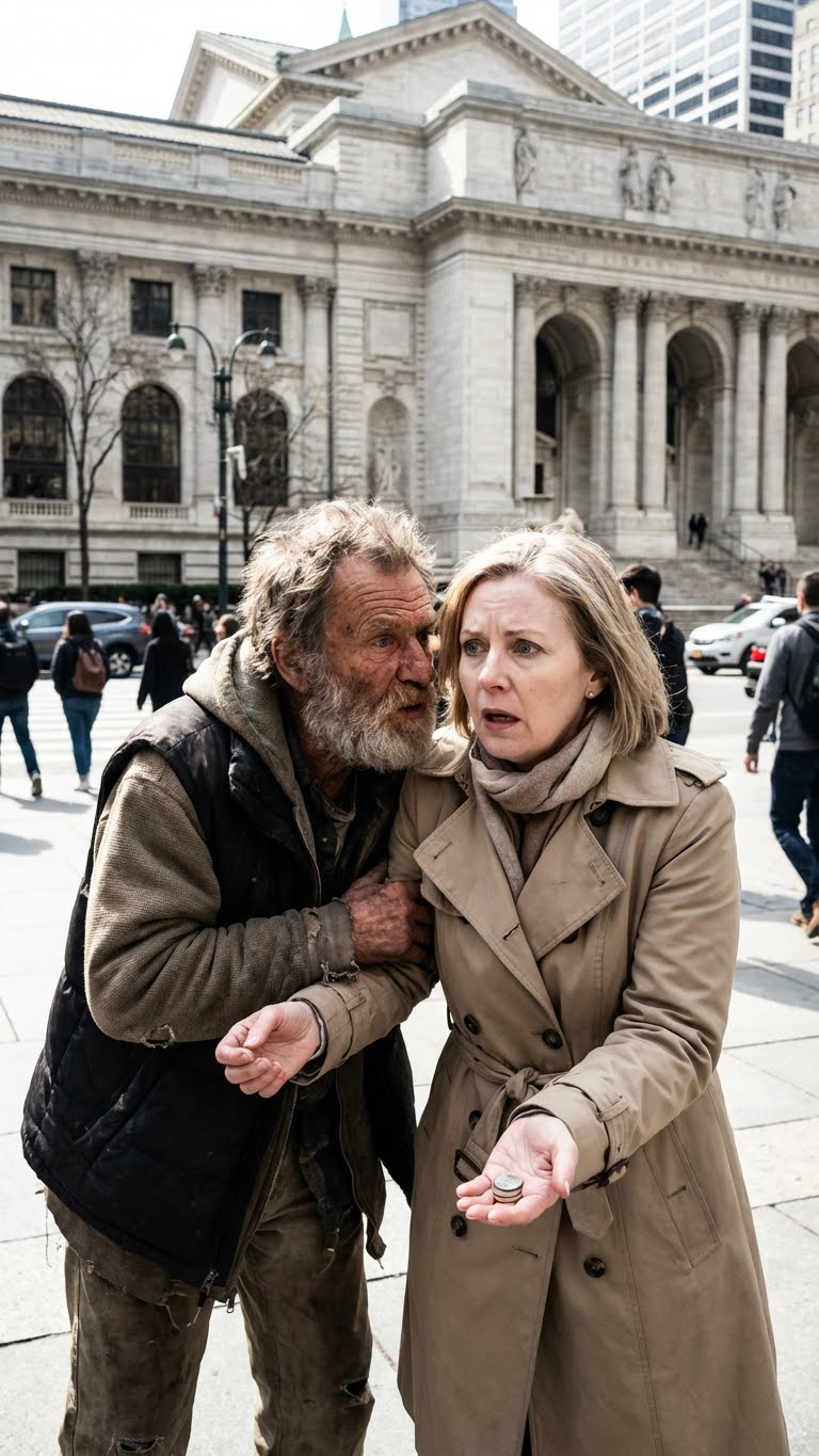 Nadat mijn man was overleden, kreeg ik een nieuwe baan en liet ik elke dag een beetje geld achter voor een oudere, dakloze man die buiten de bibliotheek zat. Op een dag, toen ik weer eens bukte, greep hij plotseling mijn arm vast en zei: ‘Je bent zo aardig voor me geweest. Ga vanavond niet naar huis. Blijf in een hotel. Morgen zal ik het je laten zien.’