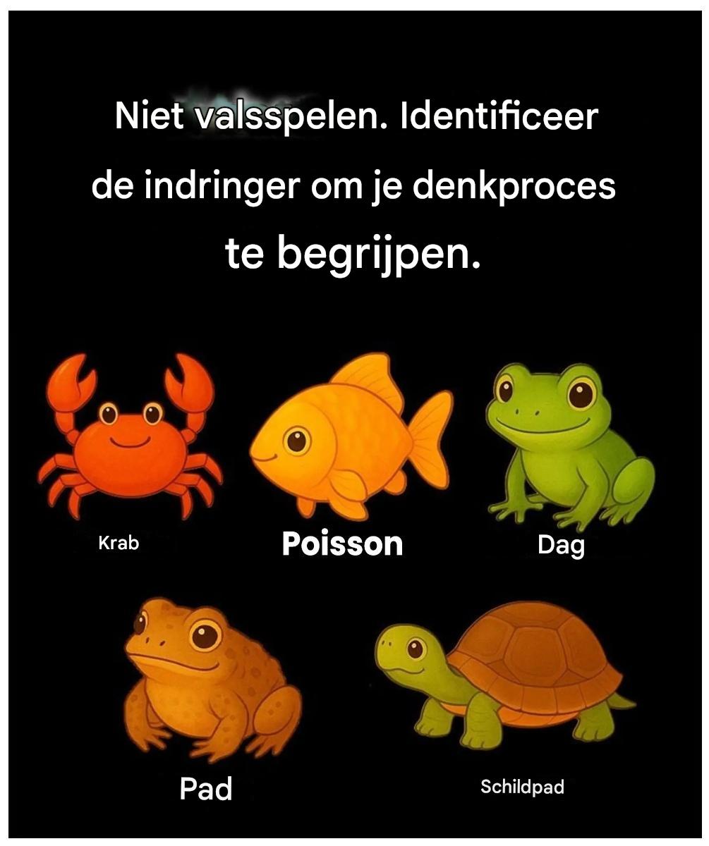 Je bent deze kleine visuele puzzels vast al eens tegengekomen op sociale media: vijf schattige dieren, één een beetje vreemd… en een verrassende onthulling aan het einde. Achter hun speelse uiterlijk gaan onze nieuwsgierigheid schuil: waarom kiezen we spontaan voor het ene dier boven het andere? Wat zit er achter deze directe reflex? Wat als je eerste instinct je meer vertelt over hoe je de wereld waarneemt dan je denkt? Voordat je de interpretaties ontdekt, neem even de tijd om je deze vijf metgezellen voor te stellen: een krab, een vis, een kikker, een pad en een schildpad. Welke lijkt je onbewust « anders »? Houd je keuze in gedachten… daar gaan we!
