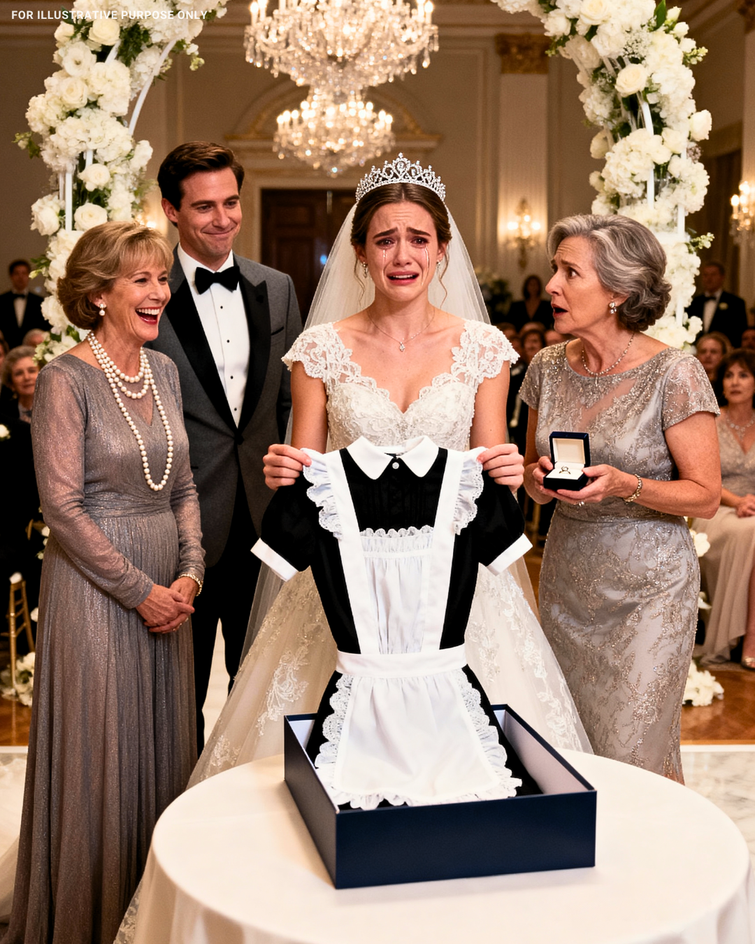 Mijn naam is Helena Rivers en niets had me kunnen voorbereiden op het moment dat mijn dochter, Chloe Rivers, roerloos op haar eigen huwelijksreceptie stond, met een huishoudstersoutfit in haar handen alsof het een vonnis was in plaats van een cadeau.