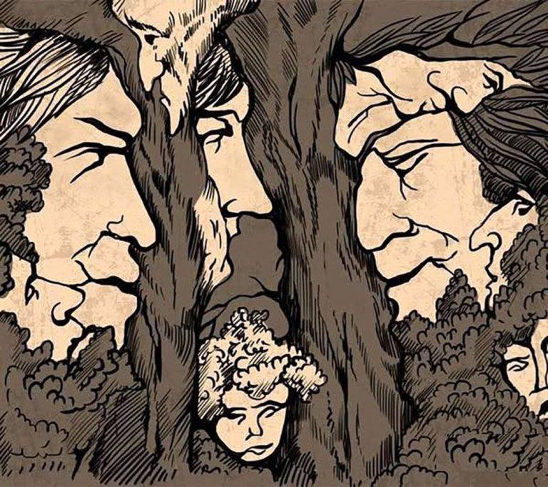 Toen ik deze illustratie voor het eerst zag, dacht ik dat het een simpel landschap was: een paar bomen, een lichte achtergrond, niets bijzonders. En toen, na een paar seconden, veranderde een detail alles. Een gebogen tak vormde een voorhoofd, een schaduw nam de vorm aan van een oog, en toen een seconde later… en plotseling kon ik die verborgen gezichten niet meer negeren. Alsof het bos zelf naar me begon te kijken.