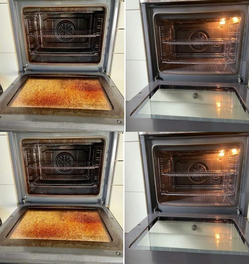 Spuit de oplossing over het hele oppervlak en de binnenkant van de oven en laat het 20 tot 30 minuten staan. Maak vervolgens schoon met een spons om hardnekkig vuil te verwijderen.