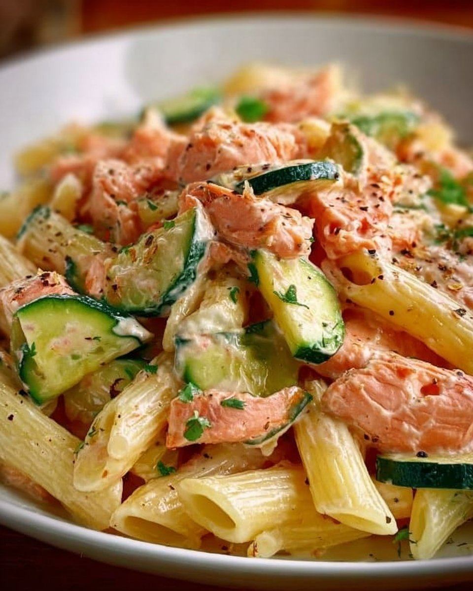 Penne rigate met courgette, gamberetti en Philadelphia al zalm