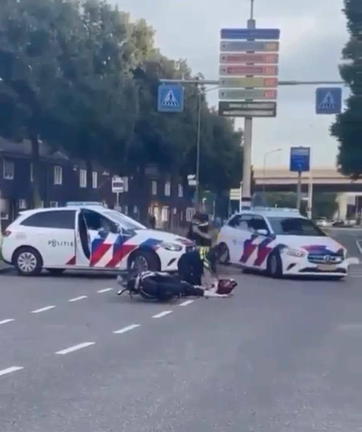 Zijn knie ligt open, zijn scooter is total loss en zijn eer is zichtbaar gekrenkt. Omringd door flikkerende zwaailichten ligt hij daar, alsof het einde van een Netflix-thriller zojuist werd gefilmd.