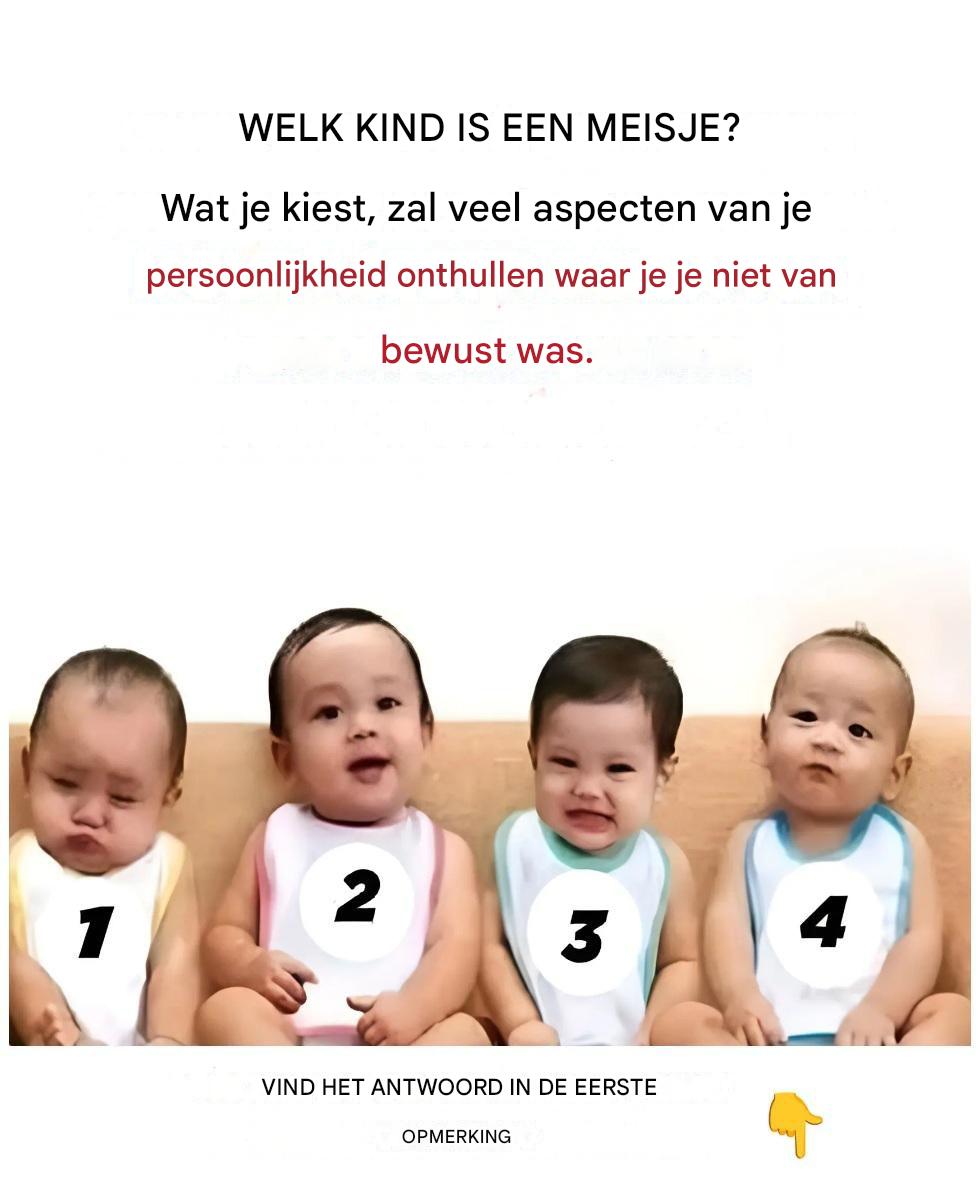 Je ziet een schattige afbeelding: vier kinderen naast elkaar, genummerd van 1 tot en met 4, en een simpele vraag: « Welk kind is een meisje? » Je kiest snel, bijna zonder na te denken, gewoon « instinctief ». Wat als deze keuze meer over je persoonlijkheid onthult dan je denkt? Het is natuurlijk geen wetenschappelijke test, maar het kan een leuke manier zijn om jezelf beter te leren kennen… en een beetje te glimlachen.