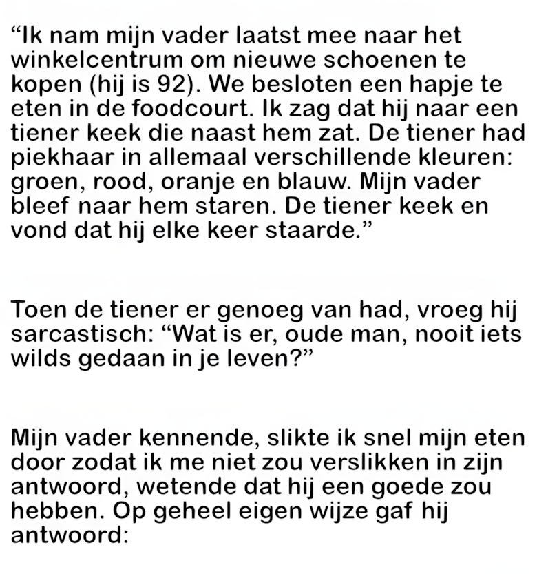 De zoon nam zijn 92-jarige vader mee naar het winkelcentrum om een nieuw paar schoenen uit te zoeken. Na het winkelen besloten ze te pauzeren in de foodcourt, waar ze gezamenlijk genoten van een snelle lunch. Terwijl ze daar zaten, viel het de vader op dat een tiener naast hen een opvallende haardracht had.