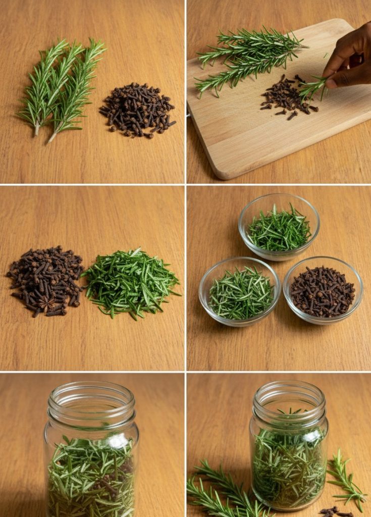 Het derde ingrediënt is rozemarijn. Rozemarijn wordt al lang gebruikt vanwege de antibacteriële eigenschappen en de werking tegen roos, en het geeft het haar ook een natuurlijke glans. Voeg 2 tot 4 takjes rozemarijn toe aan de kom.
