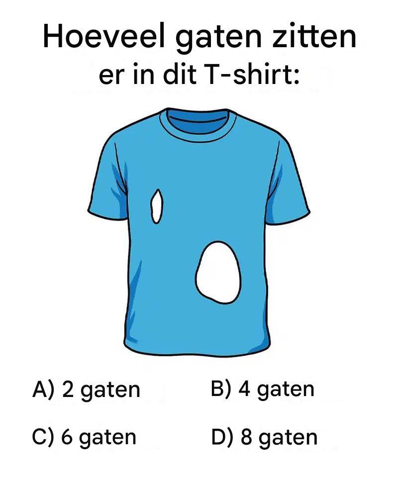 Op het eerste gezicht lijkt het een gewoon T-shirt, maar laat je niet misleiden. Deze afbeelding heeft mensen op internet in verwarring gebracht, discussies, twijfels en meer dan eens een « aha! »-moment veroorzaakt. De uitdaging lijkt simpel: hoeveel gaten zitten er in dit T-shirt?