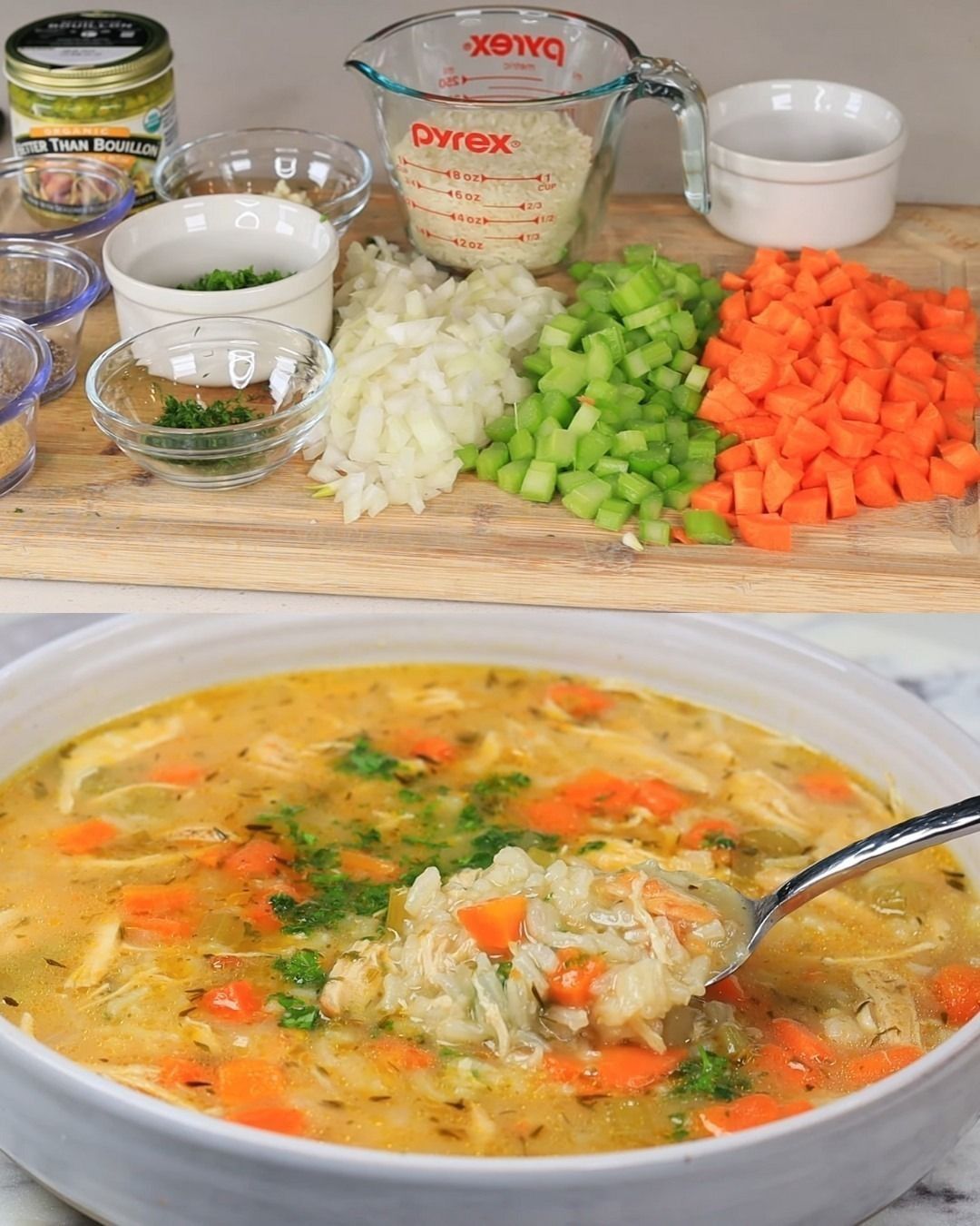Smakelijke zelfgemaakte kip- en rijstsoep
