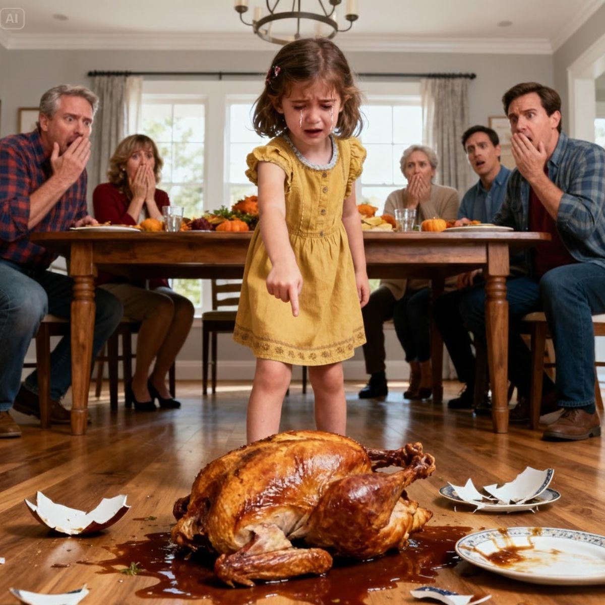 Tijdens het Thanksgiving-diner gilde mijn vijfjarige dochter plotseling, rende naar de tafel en gooide de hele kalkoen op de grond. De hele familie verstijfde. Ik knielde neer, probeerde kalm te blijven en vroeg: « Waarom deed je dat? » Ze hijgde en hief haar handen op alsof ze net de wereld had gered. « Omdat ik iedereen heb gered! » Niemand begreep het… totdat ze de woorden fluisterde die de hele kamer in ijs veranderden.
