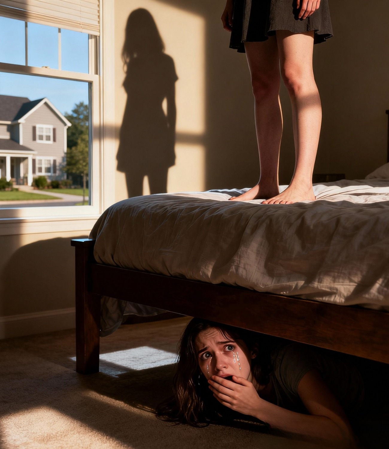 Onder het bed verstijfde ik van angst en staarde naar de schaduw van haar voeten toen ze vastberaden mijn kamer binnenstapte.