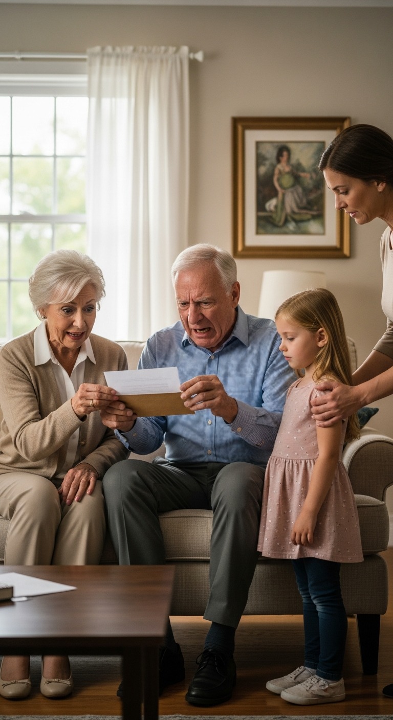 Ik belde mijn ouders om te vertellen dat mijn man was overleden. « We hebben het druk, » zei mijn moeder, « het is de verjaardag van je zus. » Dagen later, na de begrafenis, kwamen ze naar mijn huis om vijftig procent van zijn levensverzekering op te eisen. Maar mijn achtjarige dochter, Lily, was er klaar voor. Ze gaf ze een kleine, opgevouwen envelop. « Daarom zijn jullie gekomen, toch? » vroeg ze. Toen ze de envelop openden, begonnen hun handen te trillen en de wereld die ze dachten te beheersen, stortte in elkaar.