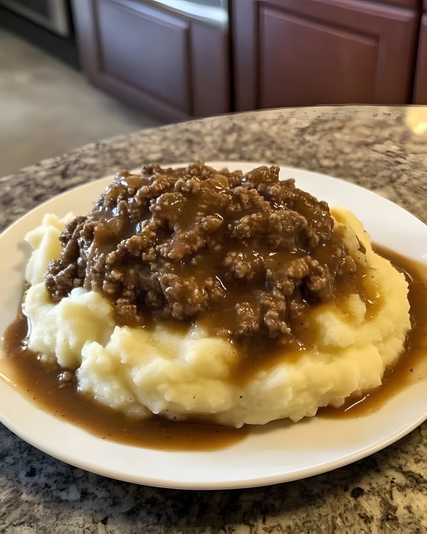 Dit stevige en smaakvolle gerecht is de ultieme troostmaaltijd! 🤤 Sappig rundergehakt dat zachtjes pruttelt in een rijke, hartige jus, geserveerd bovenop een bedje van romige, boterachtige aardappelpuree – deze maaltijd is eenvoudig te bereiden en zit boordevol smaak! Perfect voor een snelle doordeweekse maaltijd of wanneer je gewoon snakt naar iets warms en bevredigends. 🍽️✨