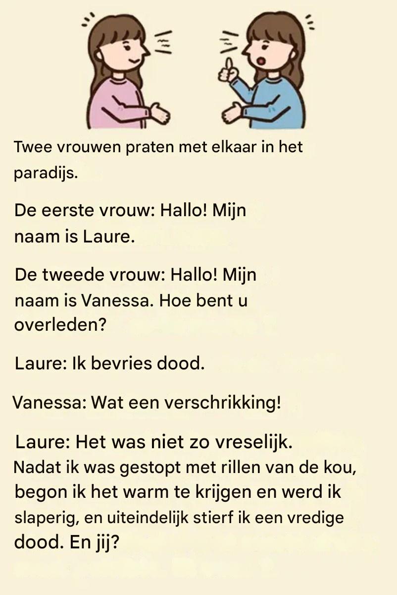 Tweede vrouw: « Overtuigd dat er ergens nog een vrouw verborgen zat, heb ik het hele huis nauwgezet doorzocht. Van zolder tot kelder, van kasten tot bedden, ik heb elke hoek en kier onophoudelijk geïnspecteerd. Ik ging kamer na kamer af tot ik uitgeput was, tot een hartaanval me velde… en hier ben ik. »