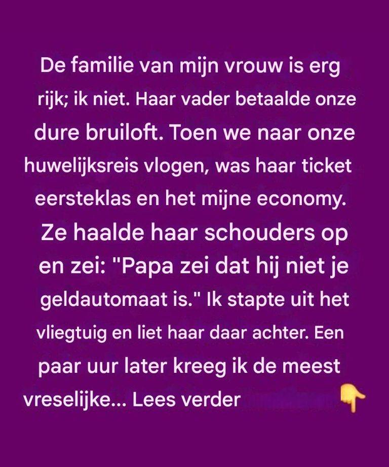 Toen ze aan boord van het vliegtuig stapten, was Darren verbijsterd toen hij hoorde dat het ticket van zijn vrouw eersteklas was en dat van hem economy. In de veronderstelling dat het een vergissing was, vroeg hij haar ernaar, maar ze antwoordde terloops: « Papa zei dat hij niet je bank is. » Deze woorden raakten hem diep. Na alle offers die hij had gebracht om een leven met haar op te bouwen, voelde dit gevoel eerder vernederend dan genereus.