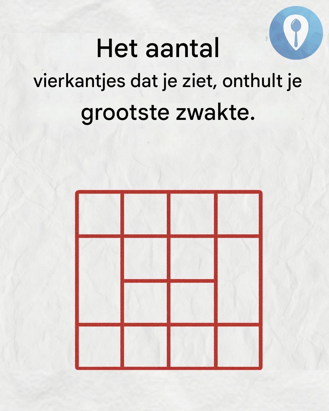 Naast of boven de afbeelding staat de opvallende zin: « Het aantal vierkanten dat je ziet, onthult je grootste zwakte. » Vervolgens wordt een korte samenvatting gegeven: