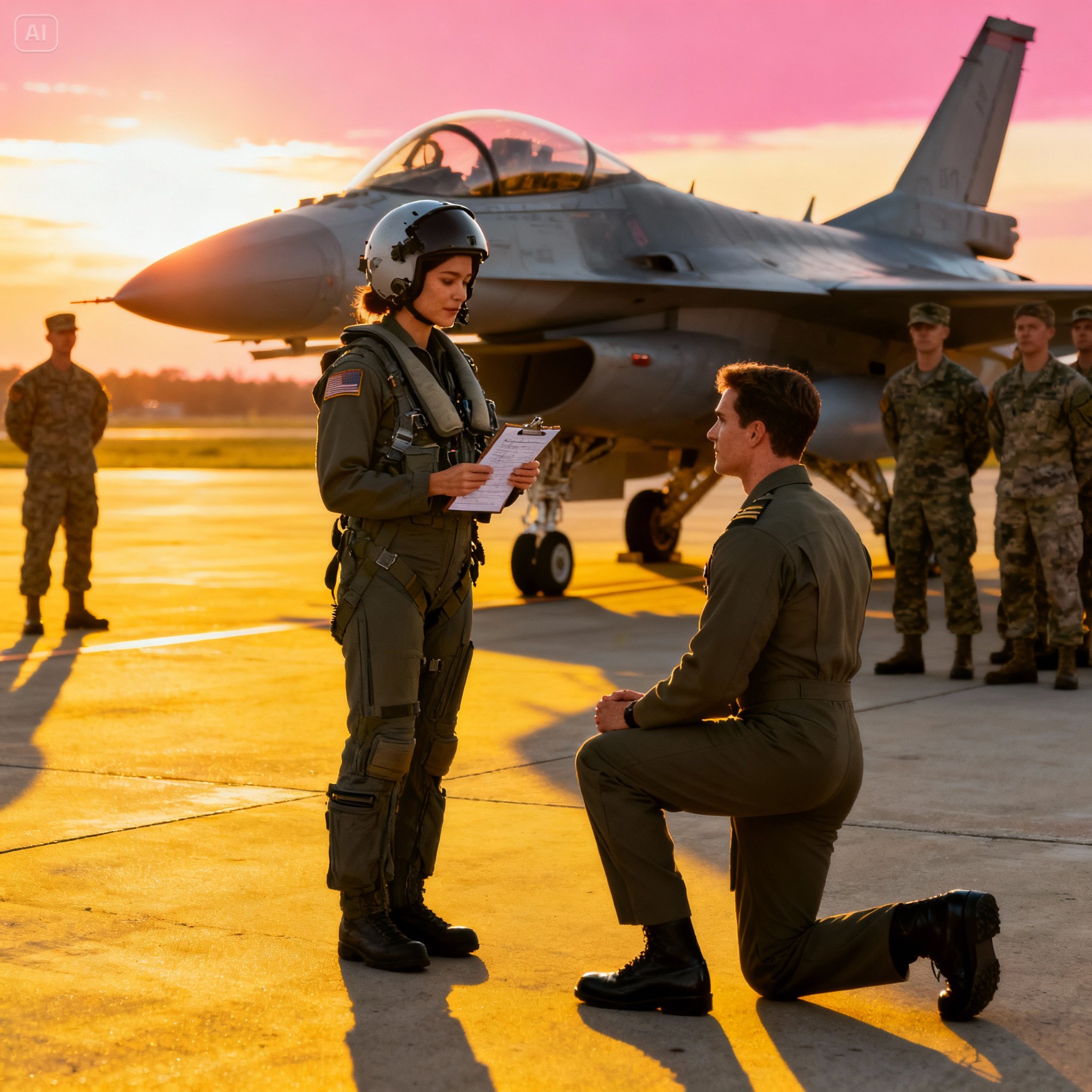 Twee jonge piloten leunden tegen een ladder, hun helmen onder hun armen, hun gezichten in een geoefende neutraliteit, zoals je die ziet bij mensen die beter weten dan hun twijfel hardop te uiten. Een van hen fronste, haar ogen vernauwden zich alsof er iets aan haar manier van lopen niet strookte met het verhaal dat hem was verteld.